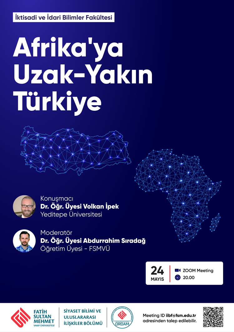 Siyaset Bilimi ve Uluslararası İlişkiler Programı, “Afrika'ya Uzak-Yakın Türkiye” başlığı masaya yatırıyor. Dr. Öğr. Üyesi Abdurrahim Sıradağ’ın moderatörlüğündeki programa Yeditepe Üniversitesi öğretim üyesi Dr. Öğr. Üyesi Volkan İpek konuk olacak.